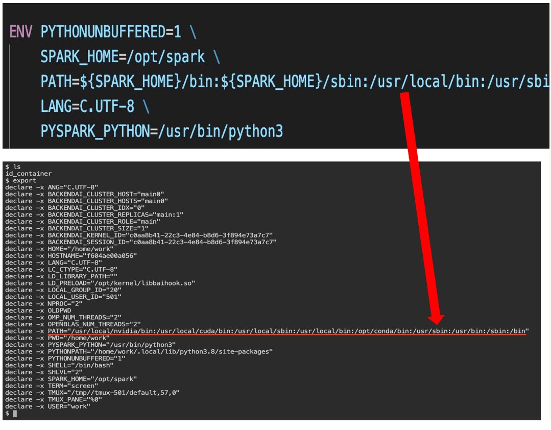 The second issue was that Spark binary files and package libraries were located under /opt, but the permissions granted by Backend.ai only allowed read and execute access to /opt, not write access.