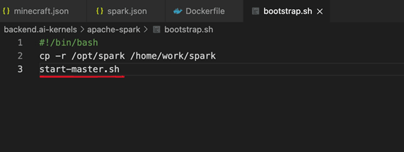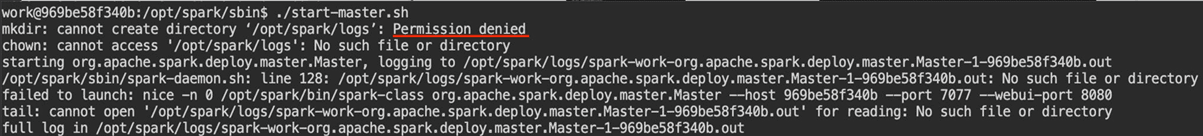This makes sense from a security perspective. To solve this, I used a bootstrap.sh file to copy the /opt/spark directory to /home/work when the container started. It wasn't an ideal solution, but it worked (though, as I'll explain later, I didn't ultimately solve it this way and changed this method when I encountered the third error).