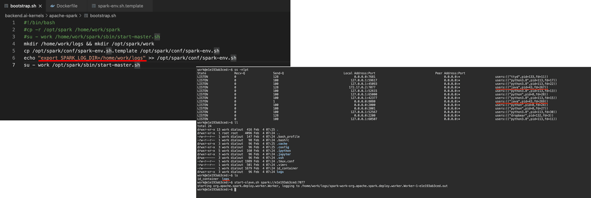 First, if I removed the package binaries from home, I had to remove the copying part in bootstrap.sh, which meant issue #2 wouldn't be solved. ~~(Wait... go back to how it was..?!!)~~ Luckily, there was a solution. A senior gave me a hint that for large projects like Spark, there should be a way to specify a separate working directory. And indeed, there was. I could specify a separate location using export SPARK_LOG_DIR in spark-env.sh. I added this to bootstrap.sh to solve it. This way, Spark could run with the necessary permissions.1
