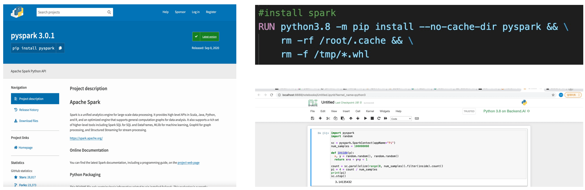 Then, I also worked on a task to make PySpark work with Jupyter Notebook. This was easy; after installing it via pip install in the Dockerfile, running Jupyter Notebook with backend.ai worked fine, as shown below.