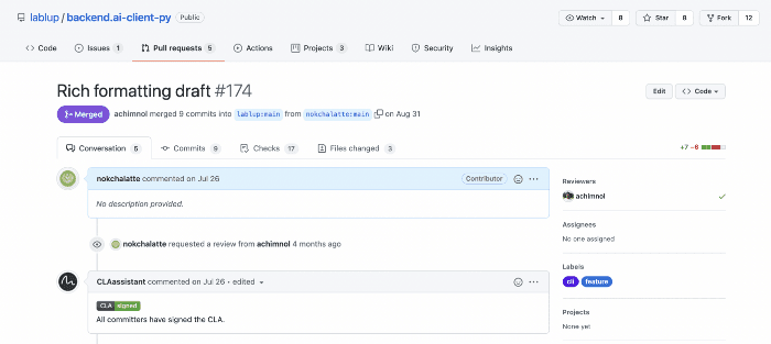 To prepare for my tasks, I learned more about Linux terminal commands, shell scripts, Docker containers, and client-server interaction. At that time, Backend.ai was about to have a major update: new support for ARM, and more consistent command conventions. A friend worked on the former, while I collaborated with another friend for the latter. It was such a memorable experience to be able to learn from friends and mentors; it reminds me that I have so much more to learn! By the end of the internship, I made the following merges to the Backend.ai repositories: