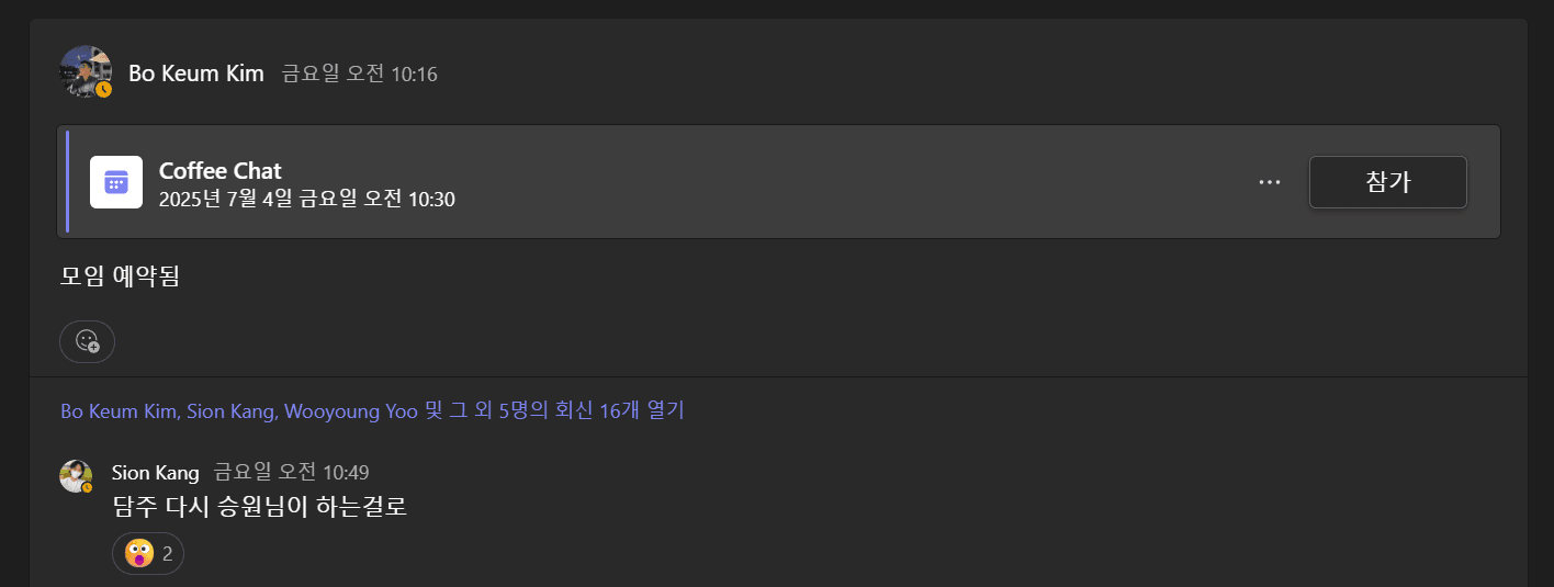 Jongeun: Company-wide, we have ‘Coffee Chat’ every Friday for 30-45 minutes, where everyone meets online to talk about non-work topics. I pushed to keep this culture going since I joined. We also sometimes gather after lunch to discuss tech or hobbies, helping build closeness if people want.